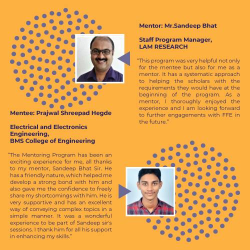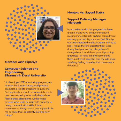 This remote program enables FFE scholars to interact in one-on-one sessions with experienced individual mentors – Engineers, Lawyers, Pharmacists, Scientists and Technologists, for a period of 4-6 months. Along with an in-house curriculum curated specially for the program, mentors also bring in their own experiences to enrich the mentorship. By inspiring and guiding FFE’s scholars, both mentees and mentors’ lives are expected to be enriched through this partnership.