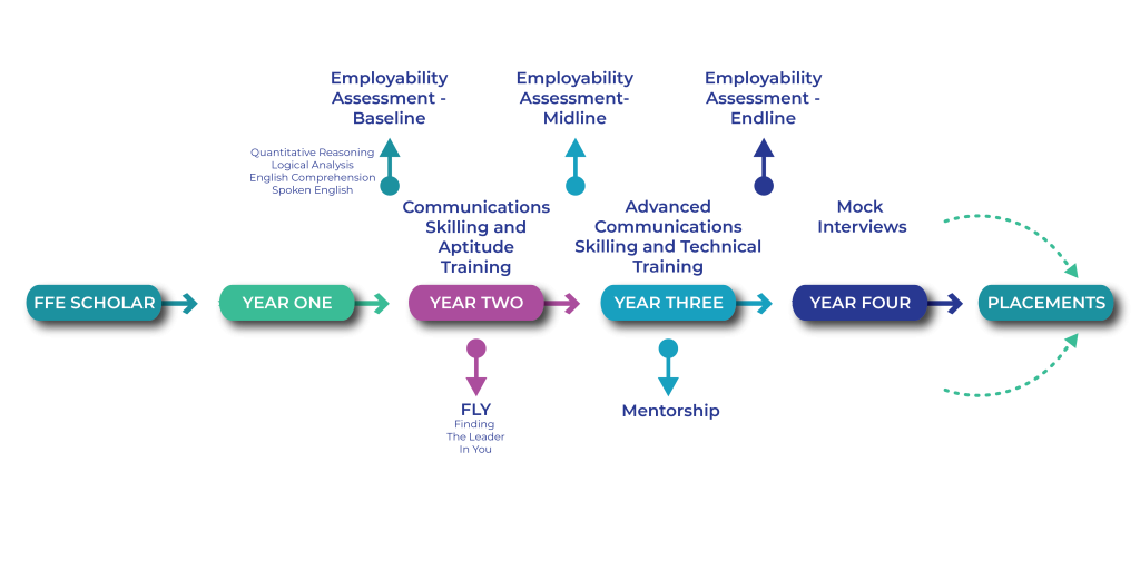 FFE’s Skill Development Program prepares its scholars for employment by providing both soft and technical skills training. The four-year program consists of a carefully selected set of courses delivered through vendor partners for Engineering, BPharm, and Law students.